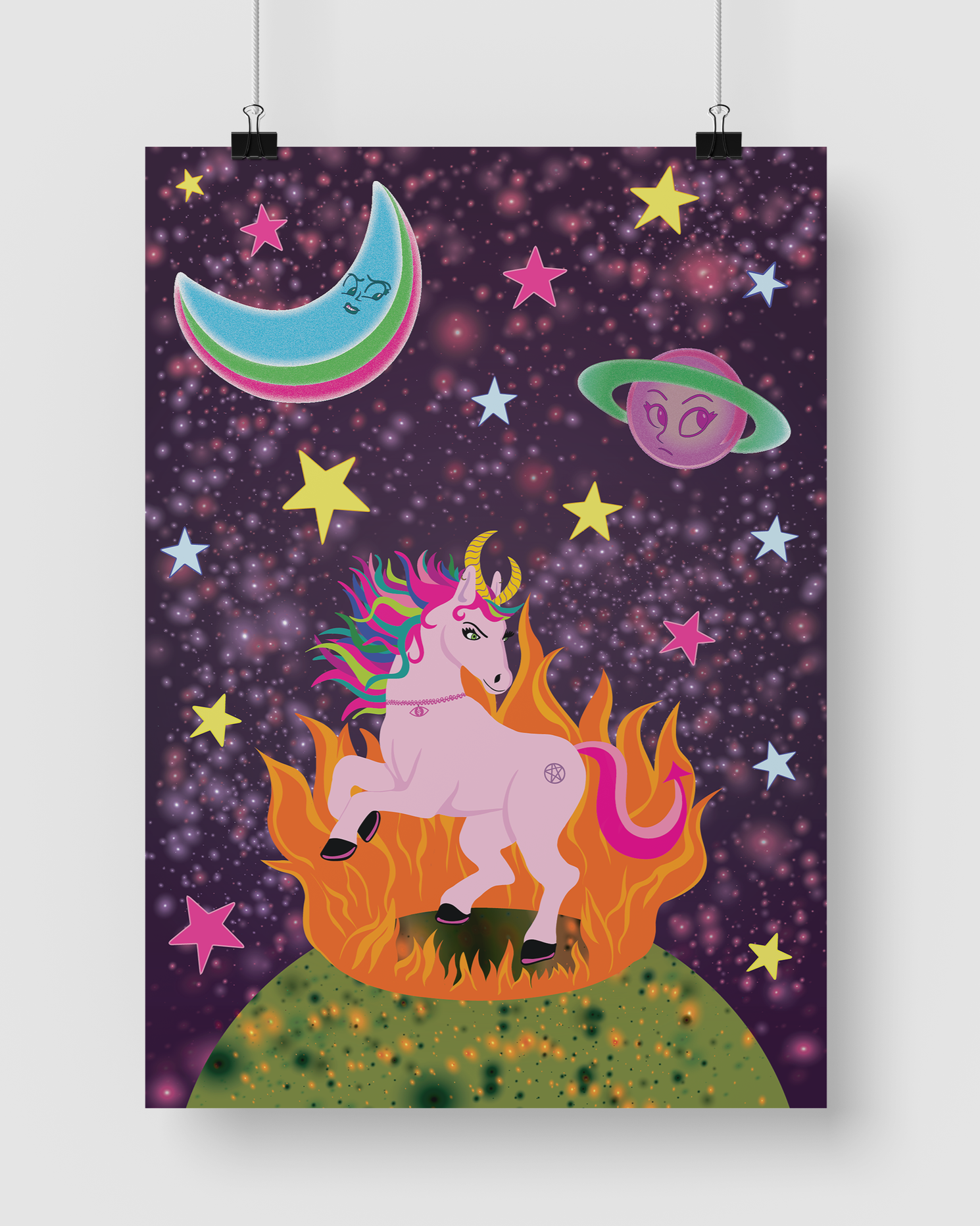 In response, I created an illustration that mimics her playful aesthetic but adds a critical twist. The piece features a devilish unicorn in outer space, surrounded by colorful stars and planets, a nod to her iconic style layered with commentary on the complexities behind the brand.